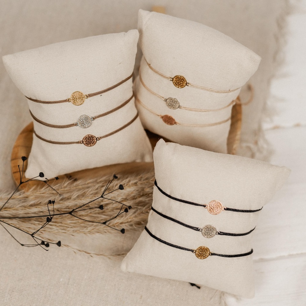 Das Band ist in Beige, Braun oder Schwarz erhältlich und dank des verstellbaren Schiebeknotens für jedes Handgelenk geeignet. Zu lange? Kein Problem – einfach kürzen und die Enden mit einem Feuerzeug versiegeln.