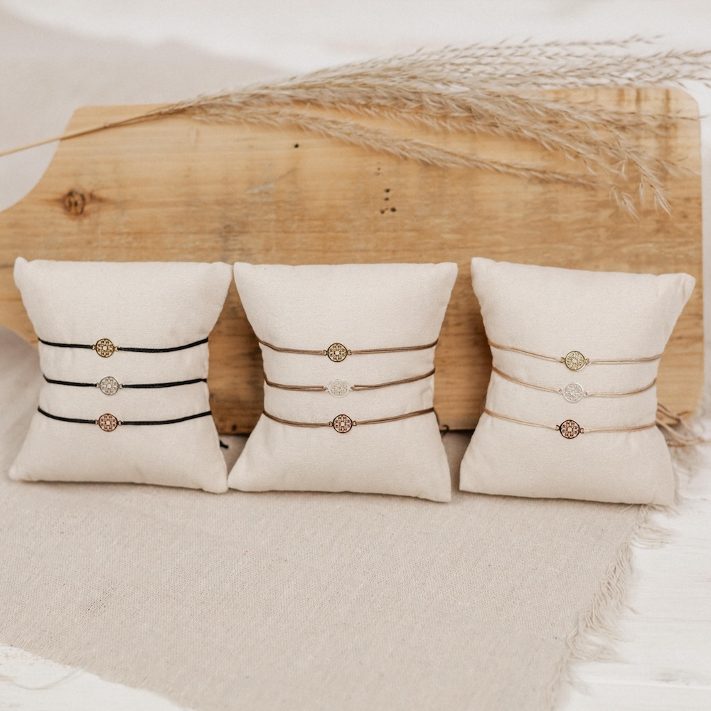 Das Band ist in Beige, Braun oder Schwarz erhältlich und dank des verstellbaren Schiebeknotens für jedes Handgelenk geeignet. Zu lange? Kein Problem – einfach kürzen und die Enden mit einem Feuerzeug versiegeln.