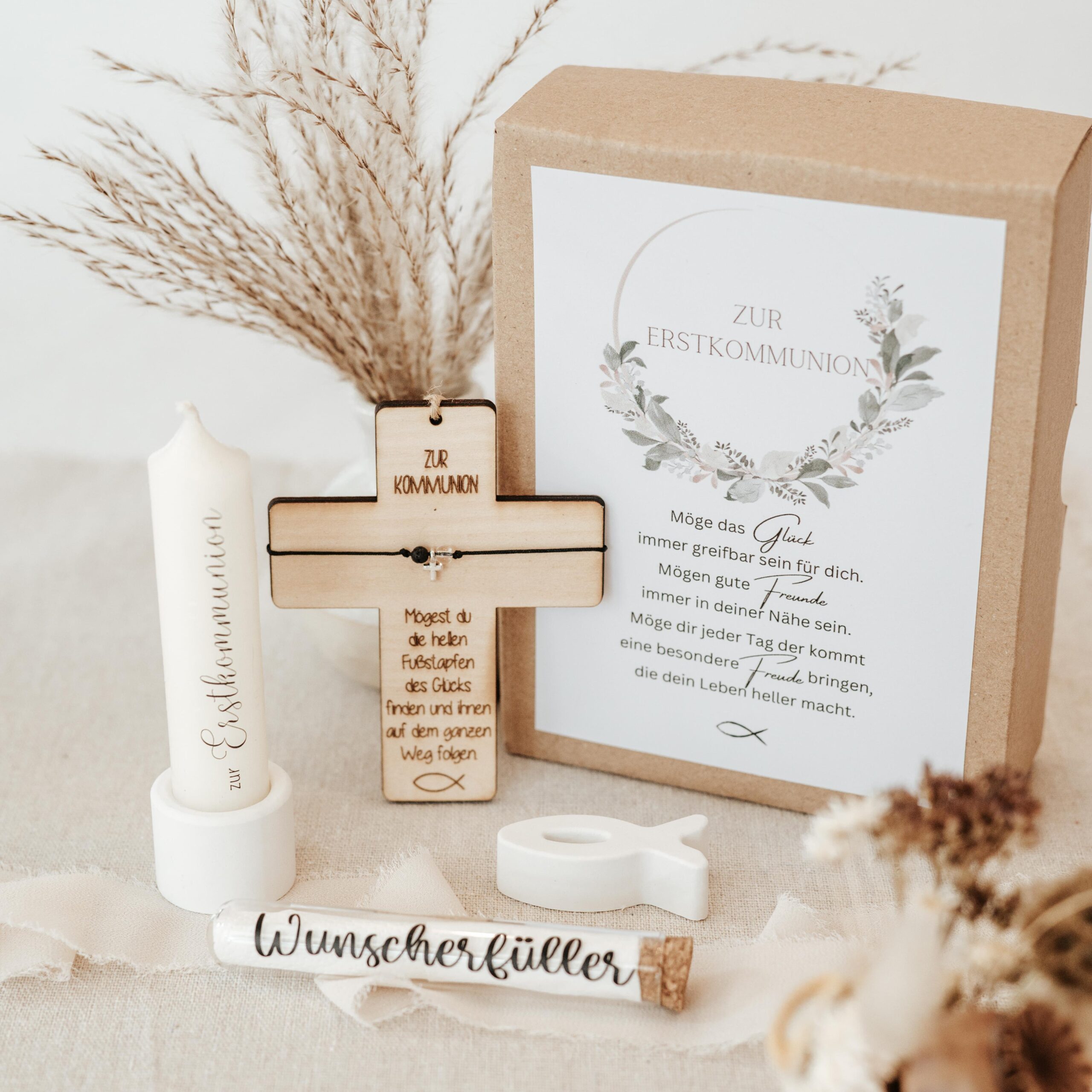 Geschenkbox zur Erstkommunion – Geldgeschenk liebevoll verpackt, inkl. Kreuz, Armband & Kerze