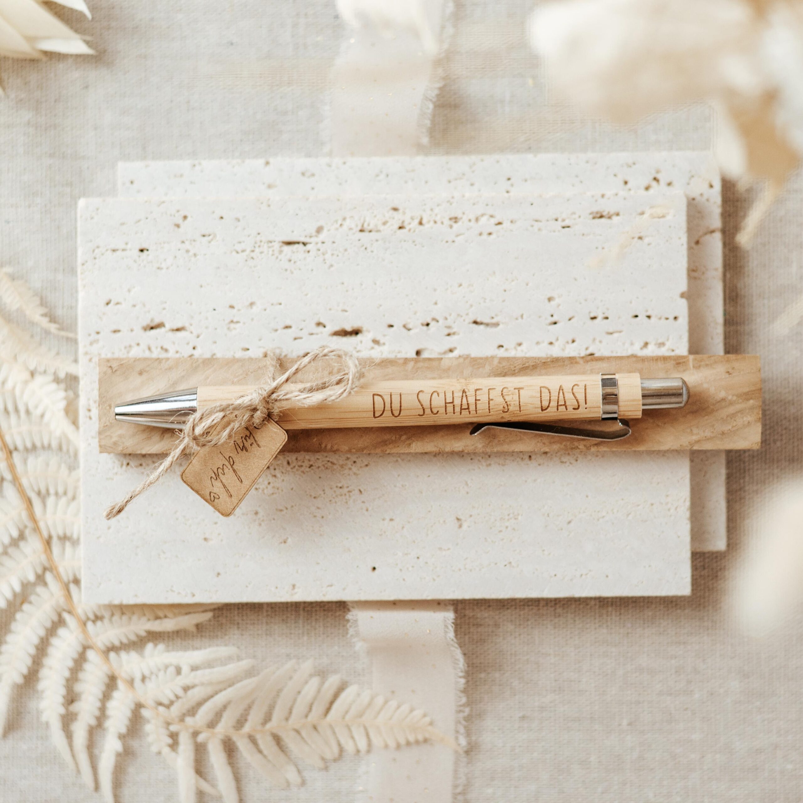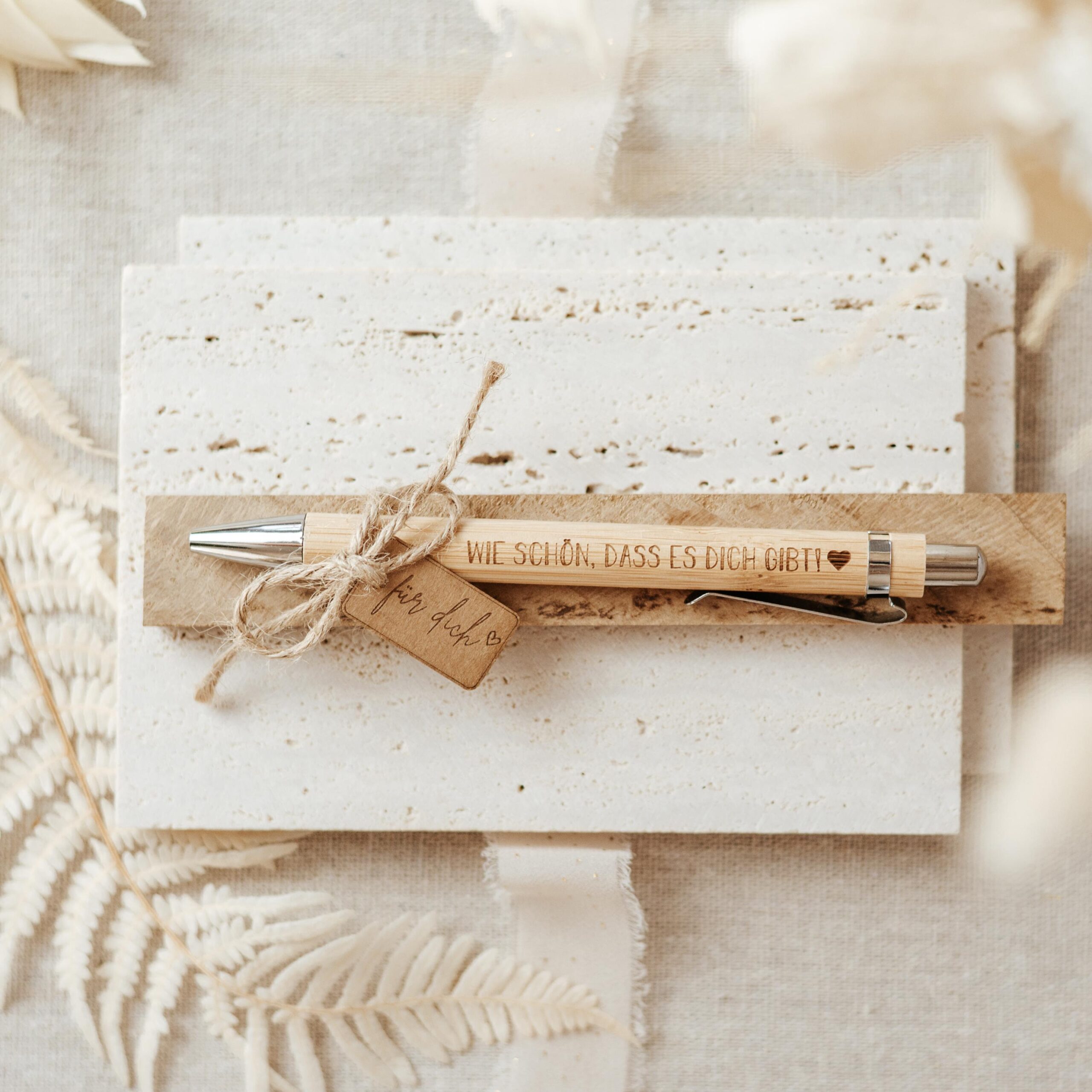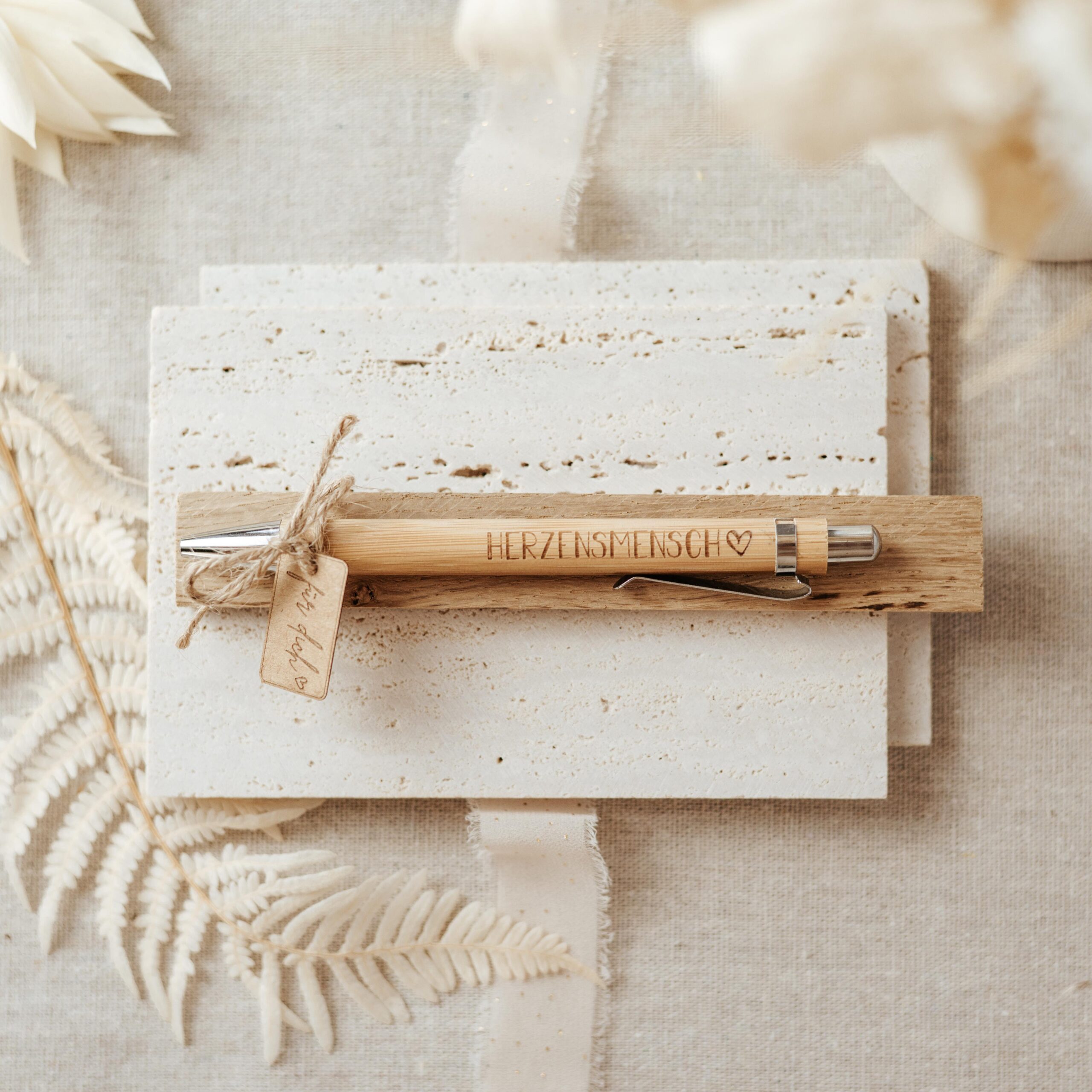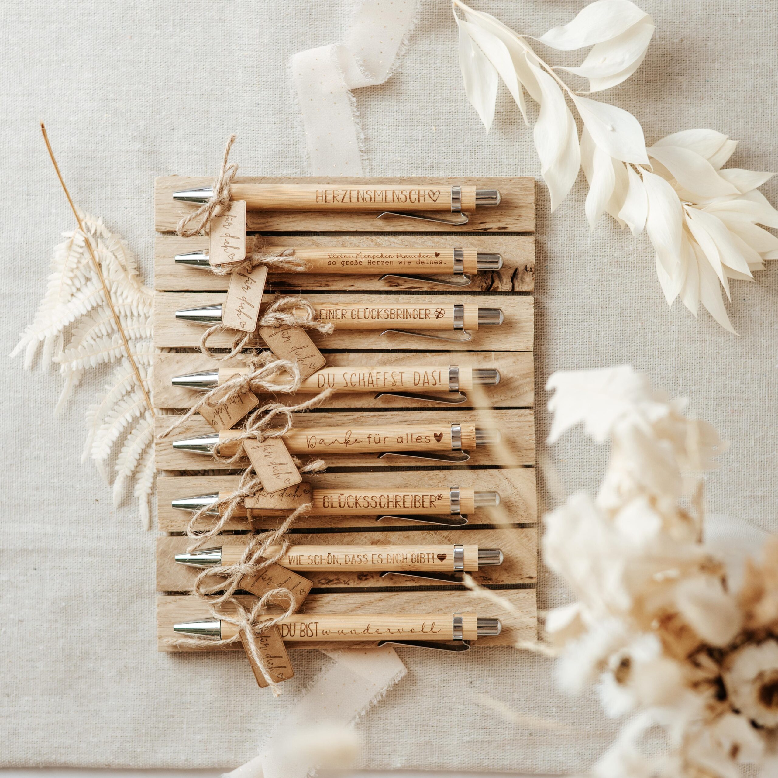 Diese Kugelschreiber aus Bambus mit schwarzer Mine sind in 8 verschiedenen Designs erhältlich. Sie kommen liebevoll verpackt (wie am Bild) bei dir an, dies vereint Funktionalität mit einer persönlichen Botschaft.