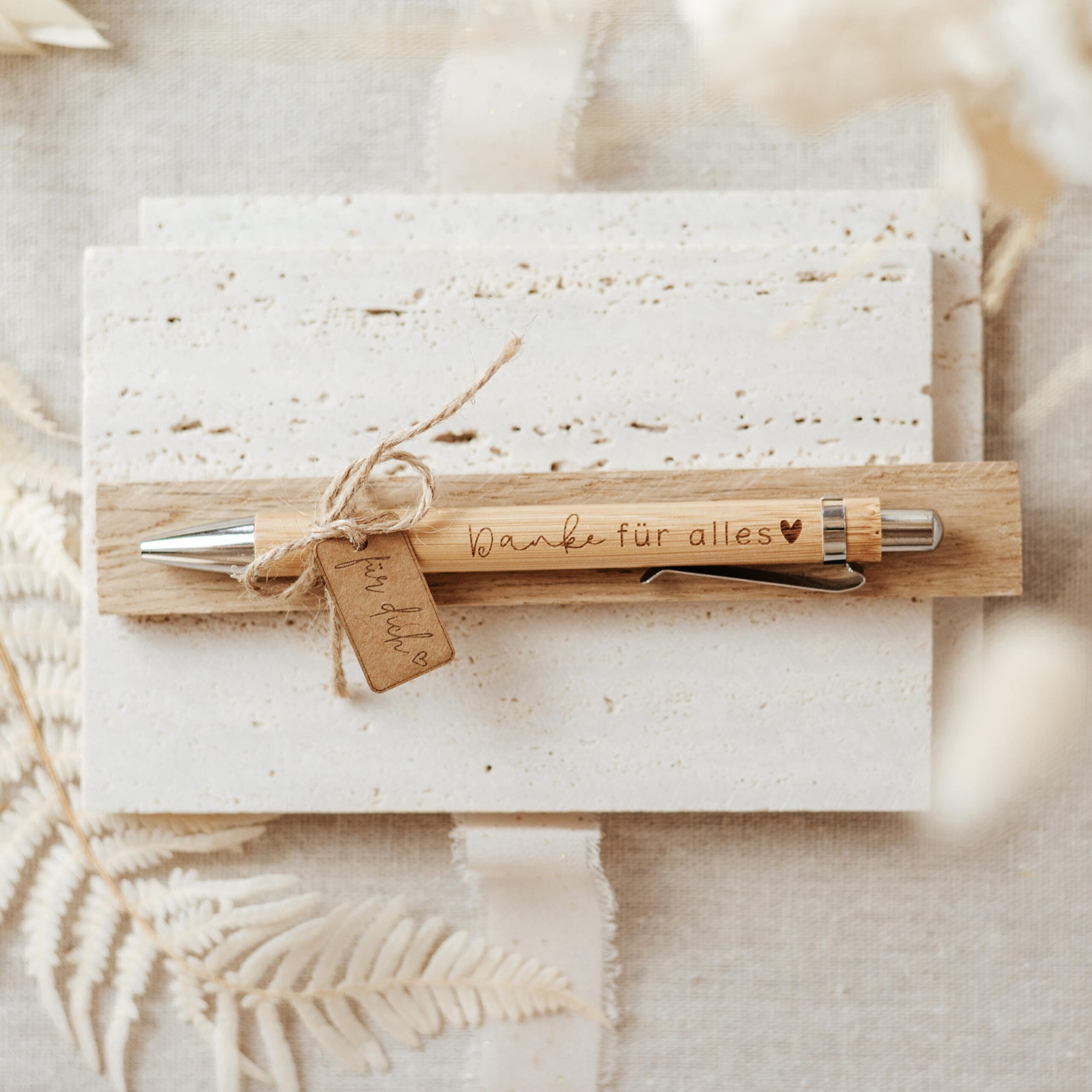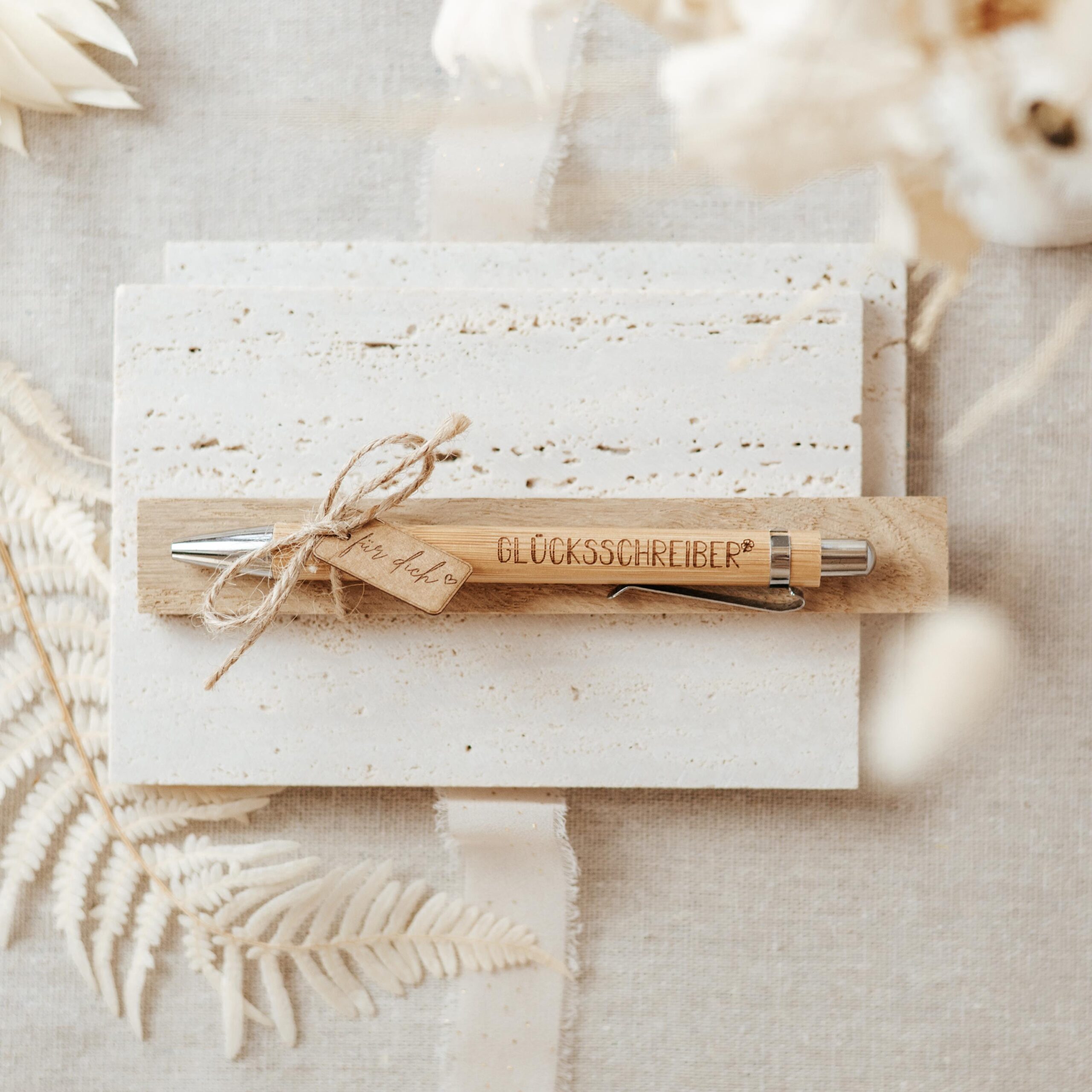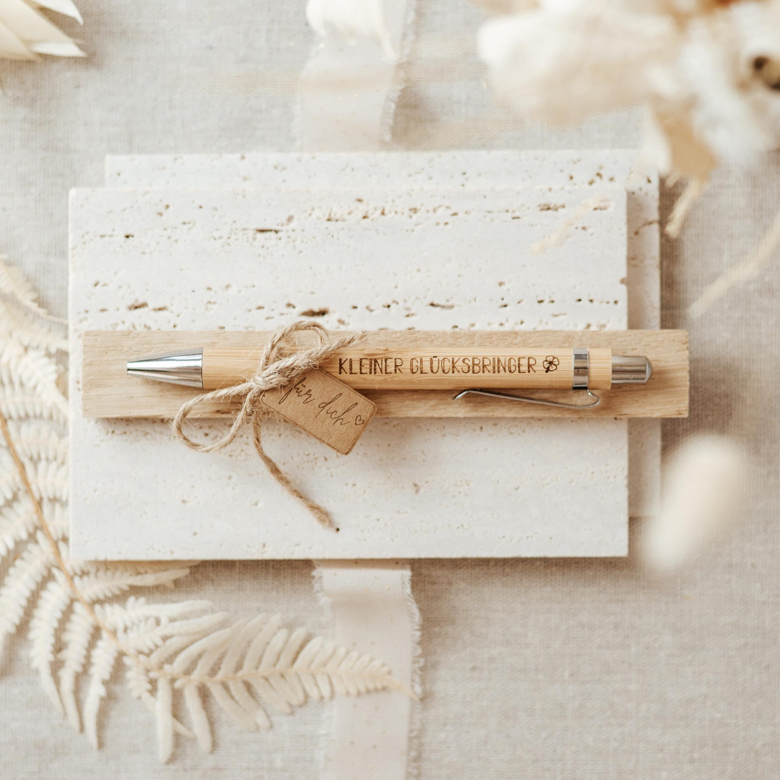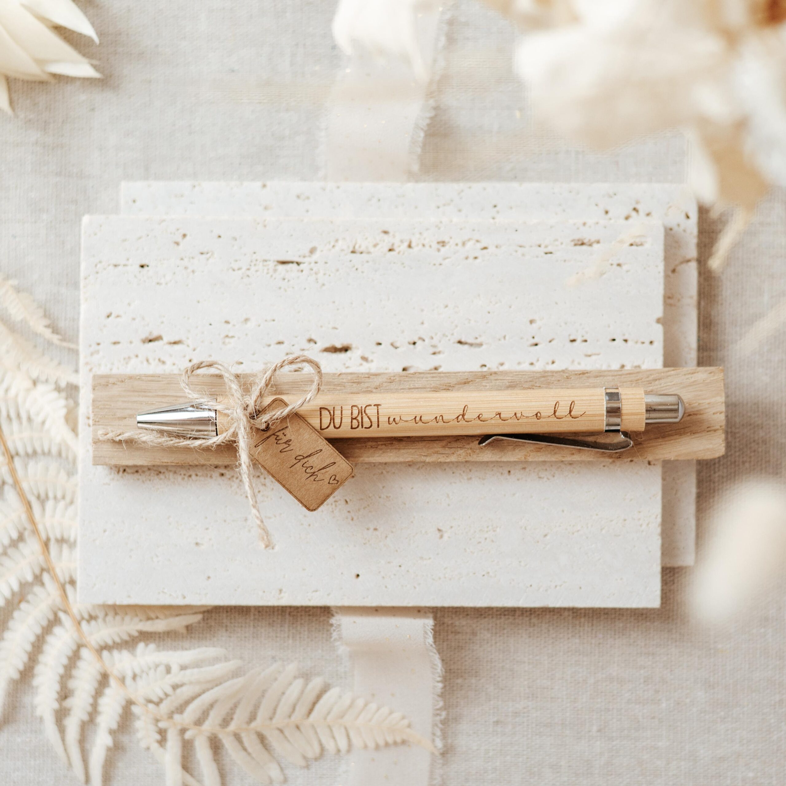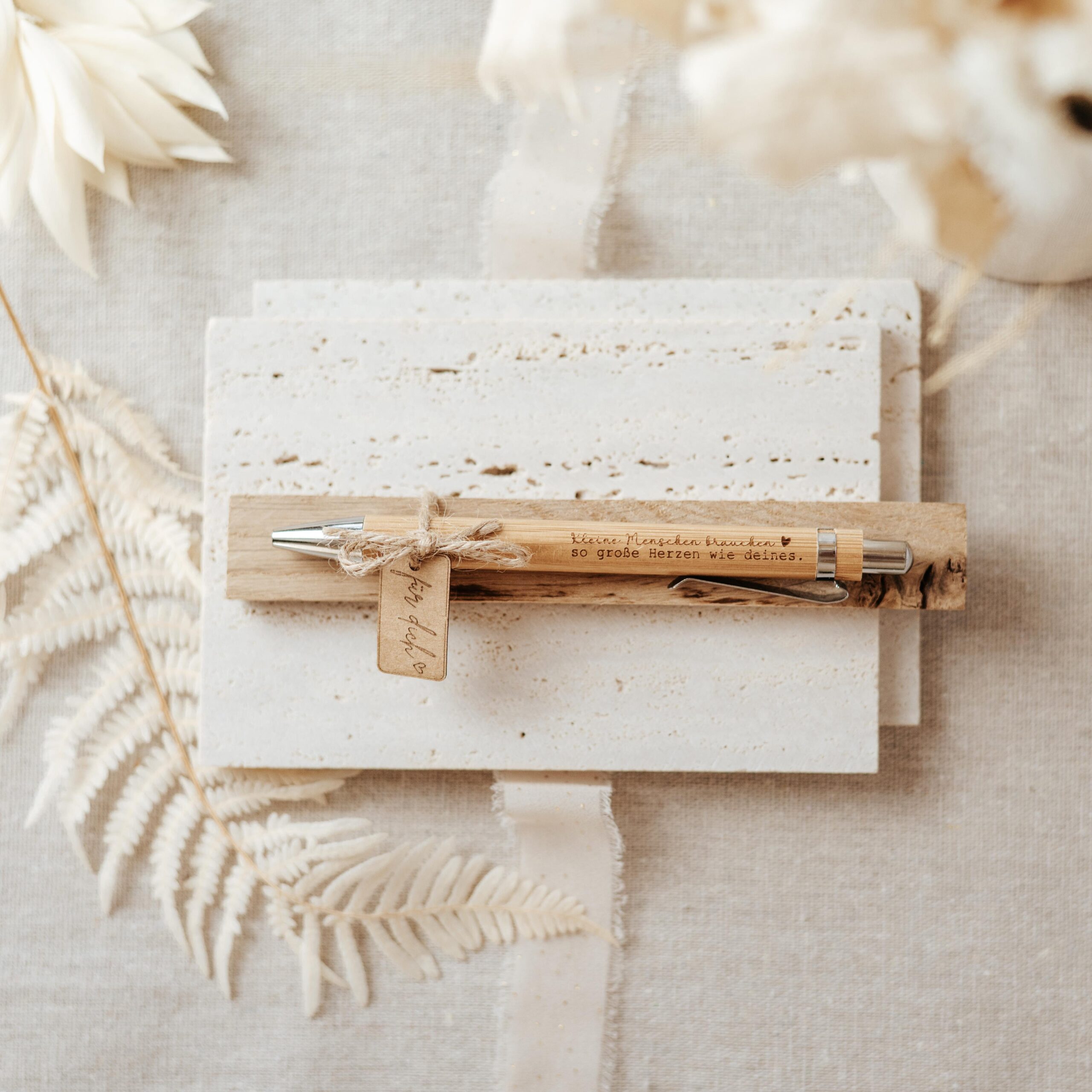 Diese Kugelschreiber aus Bambus mit schwarzer Mine sind in 8 verschiedenen Designs erhältlich. Sie kommen liebevoll verpackt (wie am Bild) bei dir an, dies vereint Funktionalität mit einer persönlichen Botschaft.