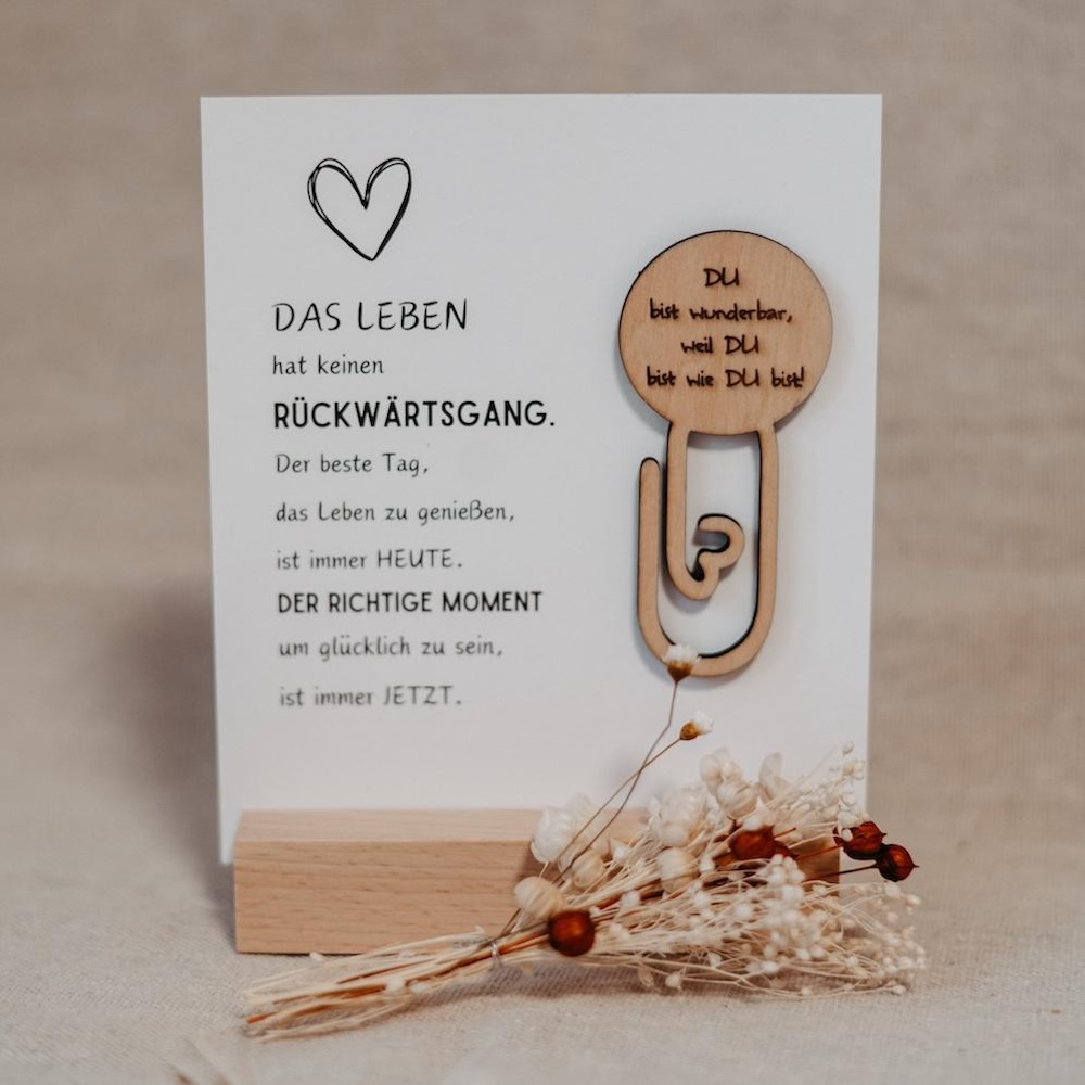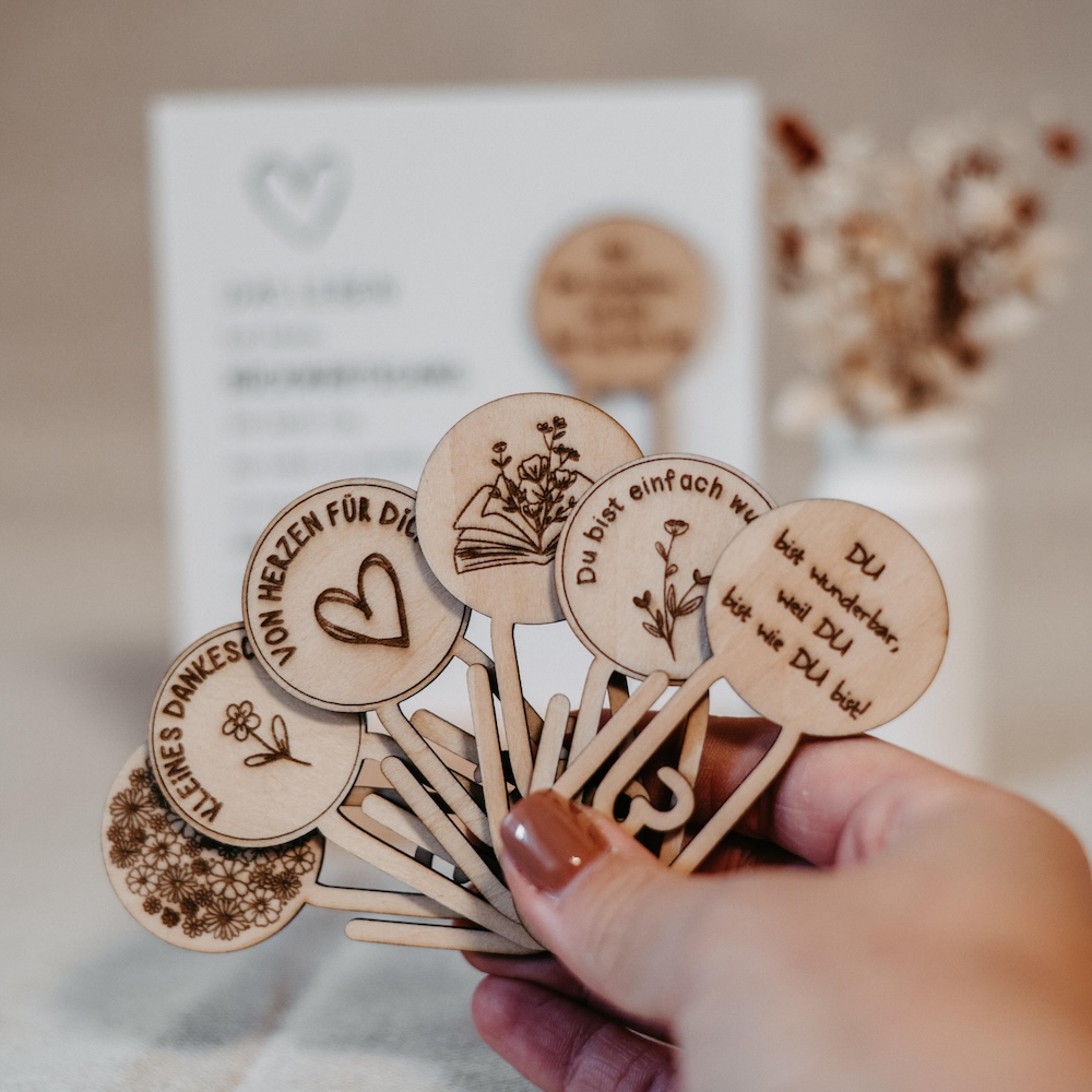 Diese liebevoll gestalteten Holz-Lesezeichen mit Gravur sind das perfekte kleine Geschenk für Bücherfreunde und besondere Menschen. Jedes Lesezeichen wird aus hochwertigem Holz gefertigt und mit einem von sechs einzigartigen Designs versehen – auf Wunsch auch personalisierbar oder im Design veränderbar. Mit einer Höhe von ca. 75 mm sind sie handlich und dekorativ zugleich. Die edle Gravur macht jedes Stück zu einem besonderen Hingucker. Verpackt wird das Lesezeichen auf einer stilvollen Karte – wählbar aus drei verschiedenen Designs. Ideal als Dankeschön, kleine Aufmerksamkeit oder liebevolle Botschaft.