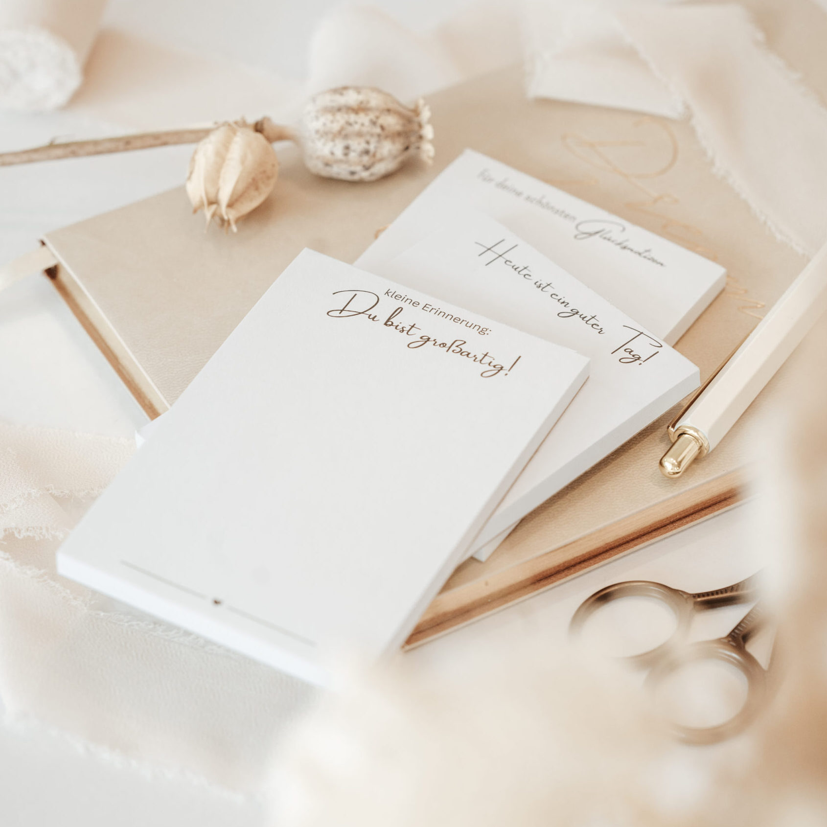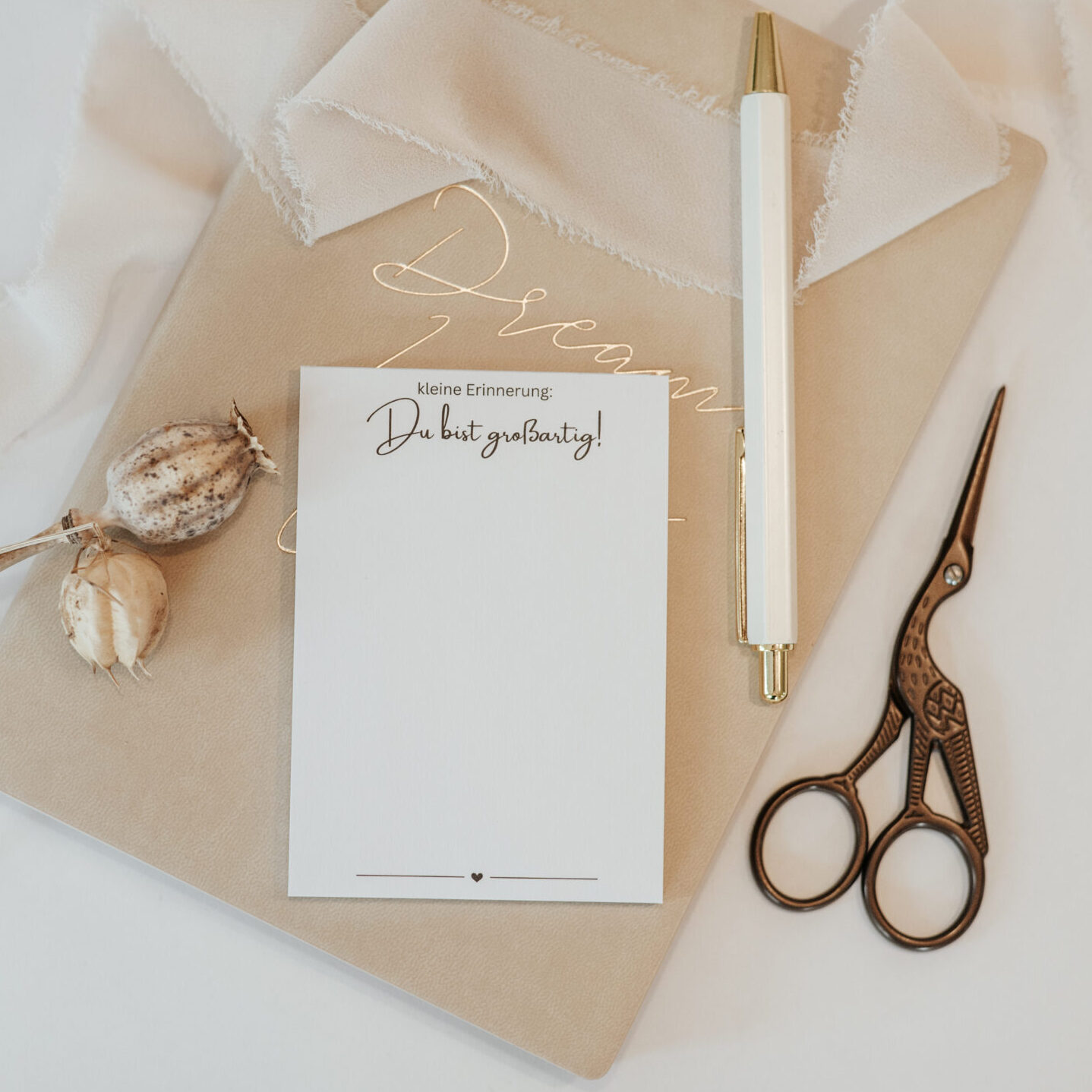 Ein kleiner, feiner Notizblock mit einer positiven Botschaft – perfekt für Gedanken, Einkaufslisten, To-dos oder kleine Erinnerungen. Jeder Block ist ein liebevoll gestalteter Alltagsbegleiter, der nicht nur nützlich ist, sondern dir auch ein Lächeln schenkt.
