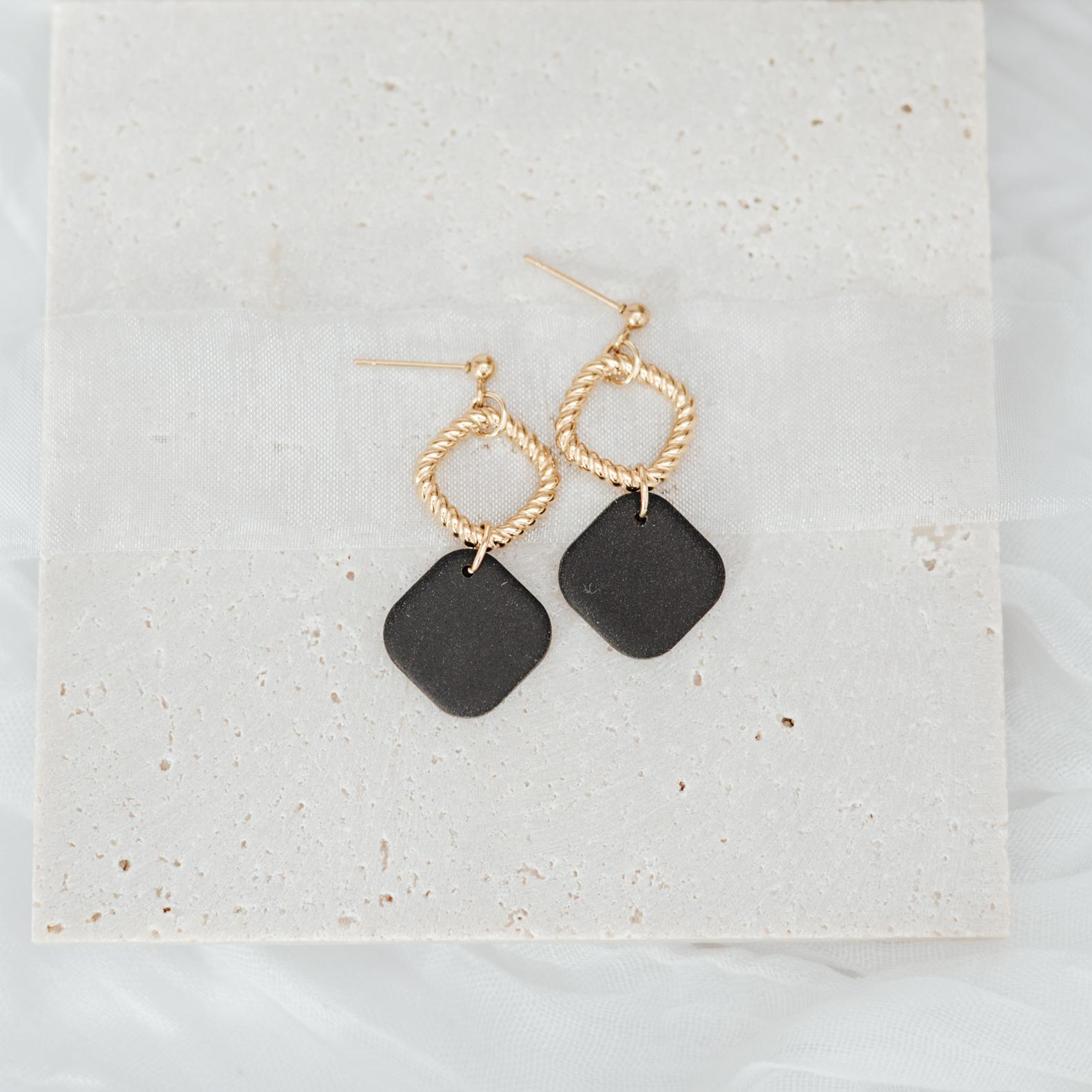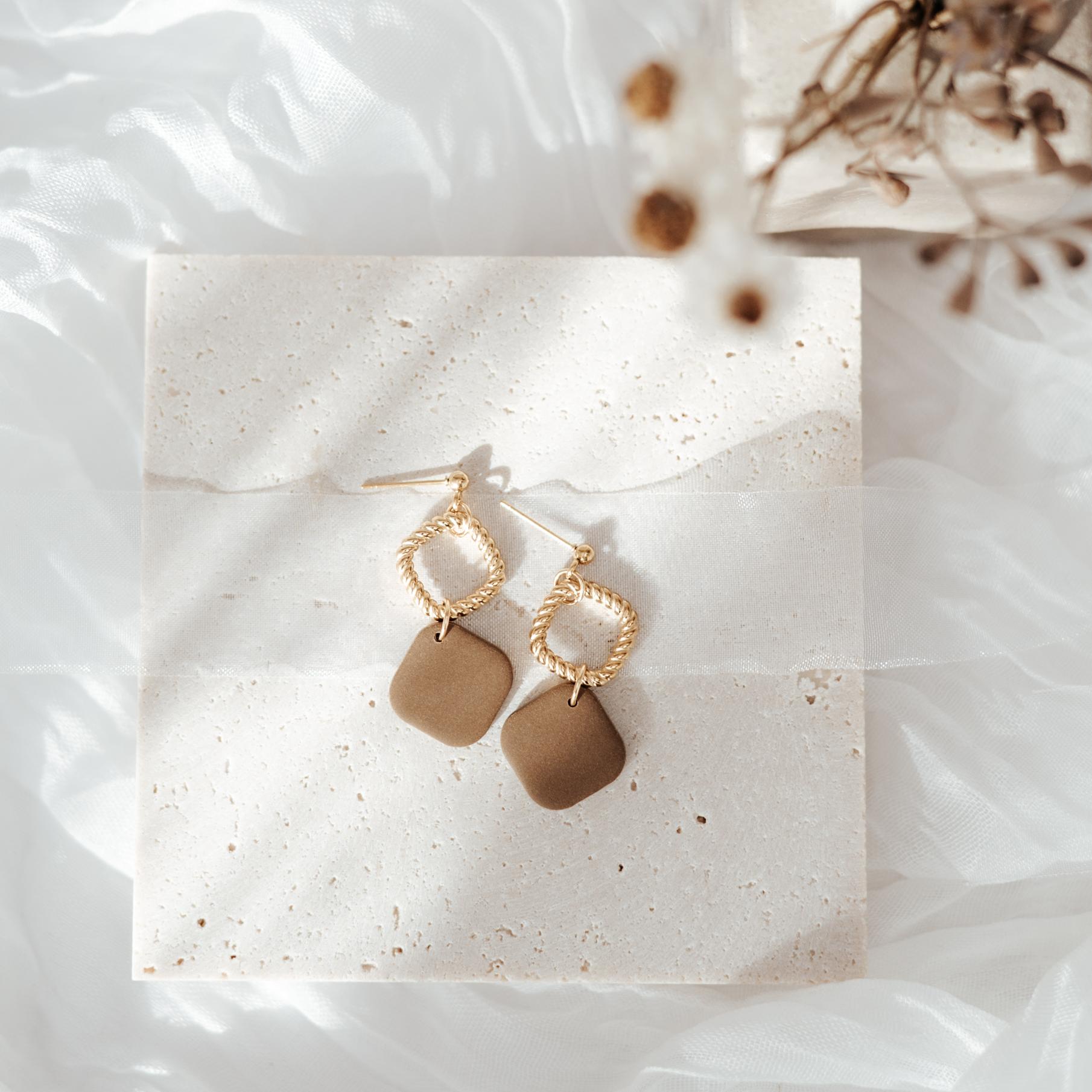 Diese geometrischen Ohrhänger überzeugen durch ihr klares, modernes Design und die harmonische Kombination hochwertiger Materialien. Der Anhänger aus Messing und PolymerClay bildet einen spannenden Kontrast zwischen filigraner Metallform und matter Oberfläche und verleiht den Ohrringen eine elegante, zeitlose Ausstrahlung.
