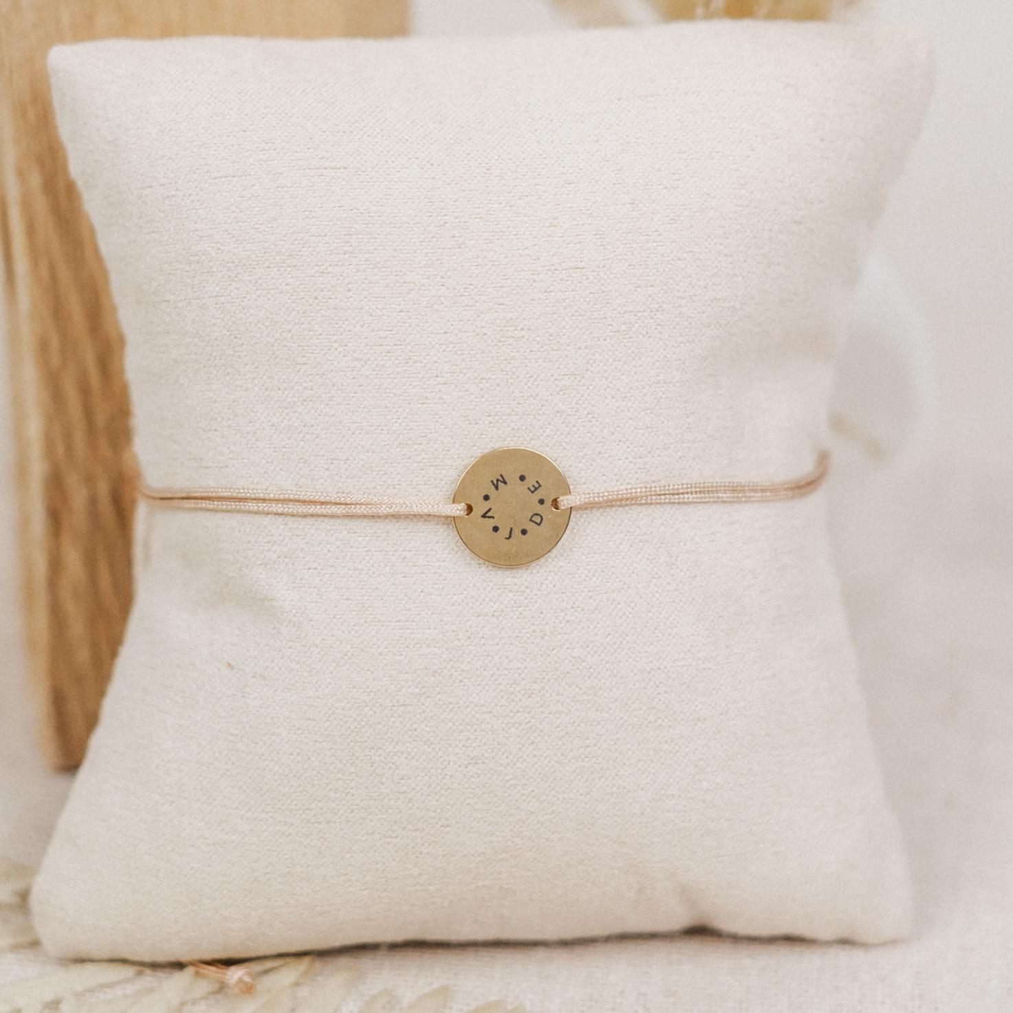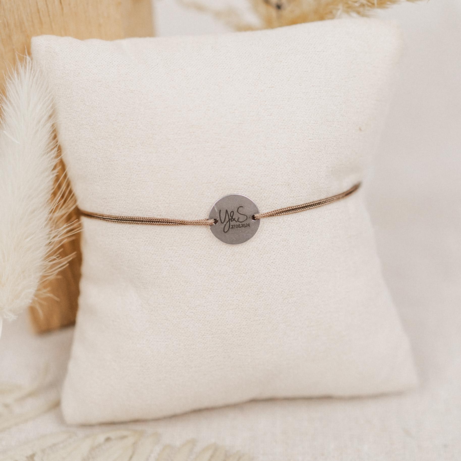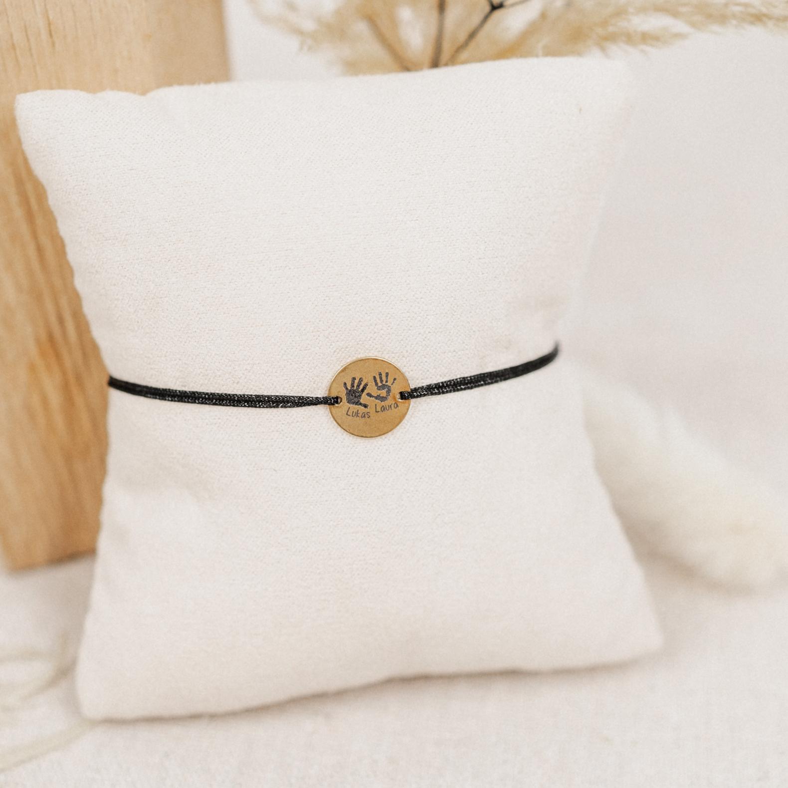 Dieses personalisierte Armband verewigt Hand- oder Fußabdrücke, Zeichnungen, Namen, uvm. als Gravur auf einem runden Edelstahl-Charm (wahlweise klein 10 mm oder groß 12 mm).